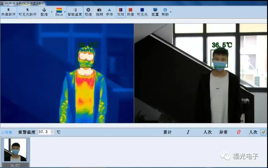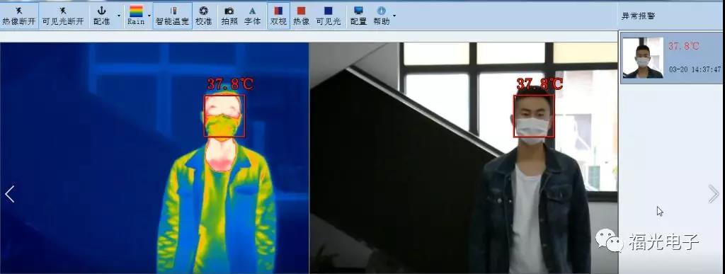 當檢測到人群中出現體溫超溫人員,系統會自動發出蜂鳴聲進行聲音報警提醒,并且超溫人員會自動顯示為紅色,系統自動抓拍一張體溫異常人員的熱像照片,便于后期統計與分析。