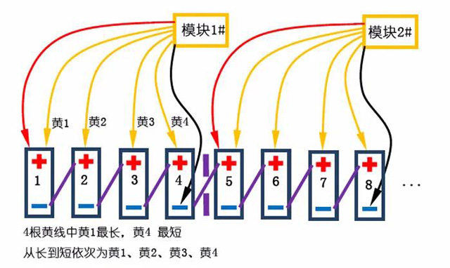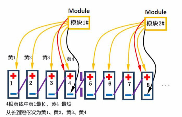 2.針對2V單體,可能出現(xiàn)電壓不滿足的情況,將臨近4節(jié)單體,按照4節(jié)單體法連接,重復(fù)的黃線不連接(紅黑線間4節(jié)單體)
