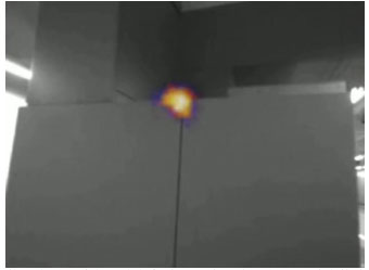 10kv配網電氣柜的三相母排因上方空調管線漏水,導致潮濕進而出現局部放電現象。通常三相母排在內部很難被發現,但通過側面的鐵絲網可以清晰地看到三相母排的放電情況,此案例說明:超聲波能量可以經由鐵絲網或柜門縫隙等空間傳遞出來,在一定條件下可用聲學成像儀進行排查。