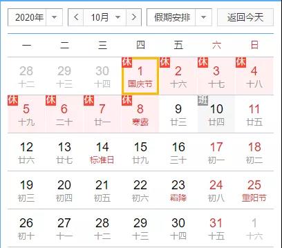 2020年10月1日—10月8日放假,共8天,9月27日(周日)、10月10日(周六)正常上班