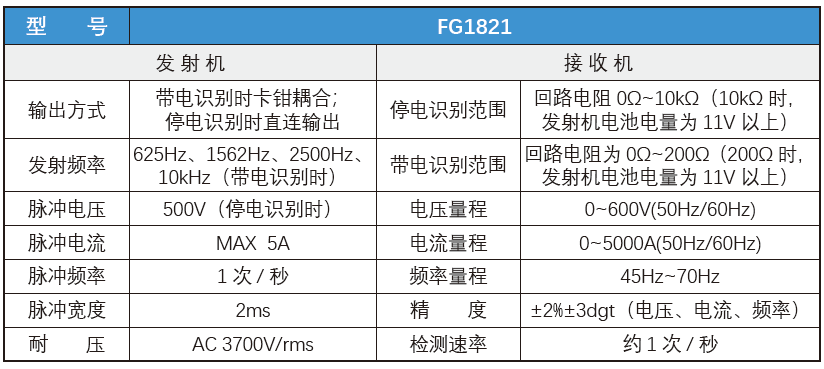 FG1821具有帶電電纜識(shí)別、停電電纜識(shí)別、交流電流測(cè)試、交流電壓測(cè)試功能。PA電子由發(fā)射機(jī)、發(fā)射電流鉗、接收機(jī)、接收柔性電流鉗等組成。