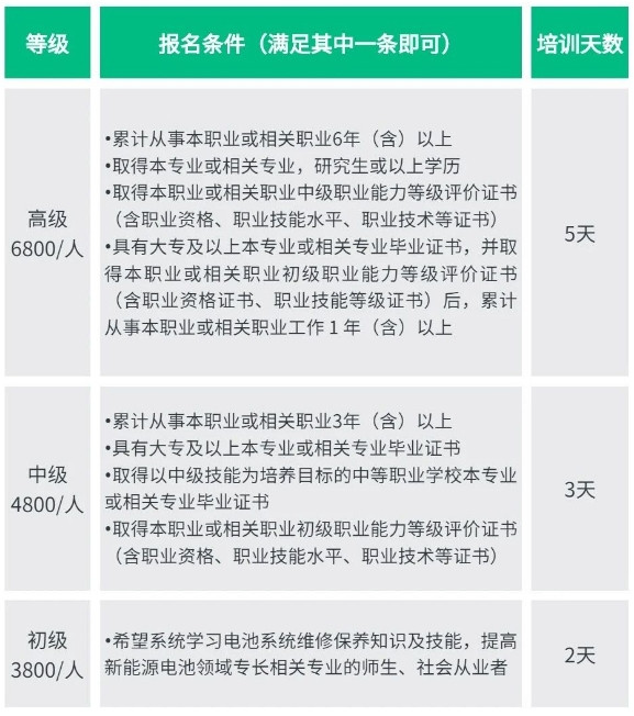 考核通過的學(xué)員將獲得工業(yè)和信息化部教育與考試中心頒發(fā)的“電池維修保養(yǎng)”(初、中、高級(jí))職業(yè)技術(shù)證書,為新能源汽車電池維修及保養(yǎng)等相關(guān)崗位儲(chǔ)備和推薦優(yōu)秀人才,拓展學(xué)員職業(yè)規(guī)劃領(lǐng)域,提升個(gè)人職業(yè)發(fā)展能力。