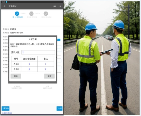 1)工單測試任務分配:系統內置一個智能任務分配??椋菹殖〔饈勻嗽斃棖?,?/span>行分配。每個測試人員在系統中接收分配到的具體任務,包括測試地點、任務類型等詳細信息。