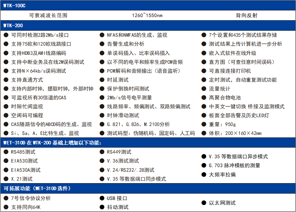 新推出的系列2M及數(shù)據(jù)鏈路綜合測試儀可用于測量與分析傳統(tǒng)E1傳輸系統(tǒng)的性能參數(shù)并處理各種故障。它們集誤碼測試、幀結(jié)構(gòu)分析、時隙分析、信念測試、信號分析、告警分析、PCM仿真等多種功能于一體。WET-310D還擁有更豐富的功能及選件功能。