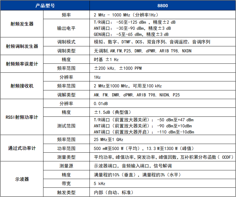 8800混搭了臺式儀表的多功能和手持式儀表的靈活性,是包含完整的模擬和數字無線電測試功能的便攜式無線電測試系統。為產業用戶提供了大尺寸的彩色高靈敏觸摸屏液晶顯示器以及無與倫比的模擬和數字測試功能,可為無線電電臺及對講機領域測試工程師提供全新的無線電測試體驗。