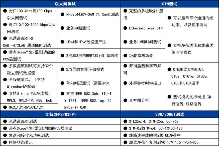 ● SFP+用于100Base-FX, 1000Base-X, 10GEBase-X, OTU2/2e/1e, STM-64/OC192, 以及光纖通道 1/2/4/8/10G 測試