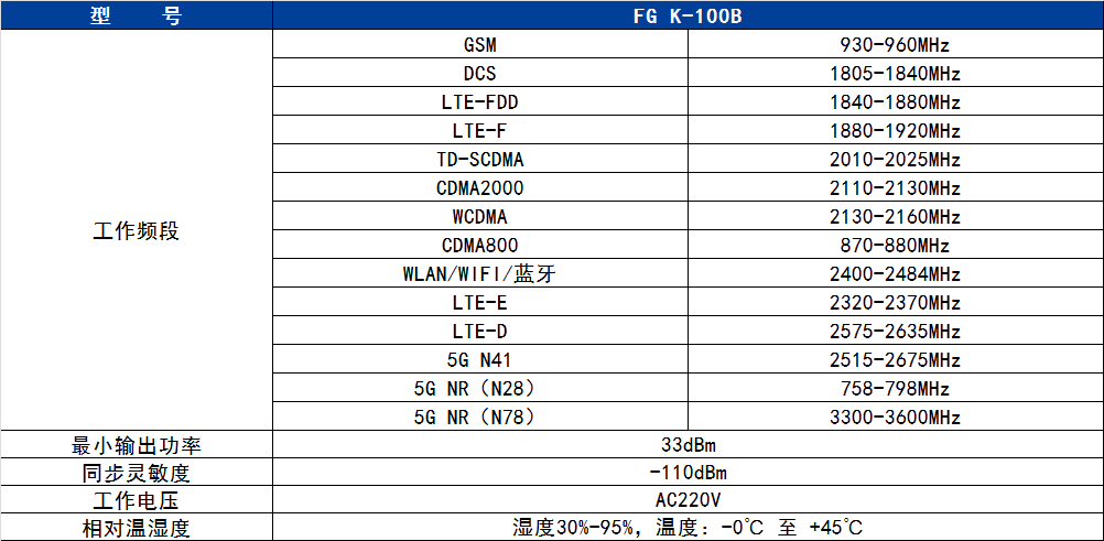 ● 對各制式頻段基站上行接收不產生干擾,設備在無法正常同步時,無上行頻段發射