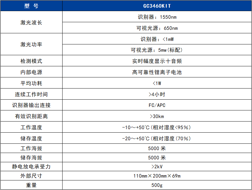 GC3460KIT 系列光纜普查儀,是專門為電信工程師或技術人員量身定做、用于準確識別光纜的精密儀器設備,具有界面友好、簡單實用、無毒無害、不損傷光纜等優點。根據光纖彈性效應、通過光的相干解調將光纜的敲擊振動信號轉換為可視信號和音頻信號,準確查找和識別鋪設于人井、隧道、管道和電桿架空等環境下的目標光纜。使用光纜普查儀時,工程人員只需要輕輕敲擊光纜,即可輕松識別出所需要尋找的目標光纜。