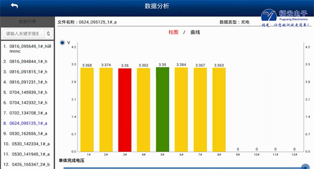 以柱狀圖或曲線圖顯示測試過程中各個電芯電壓隨時間的變化過程
